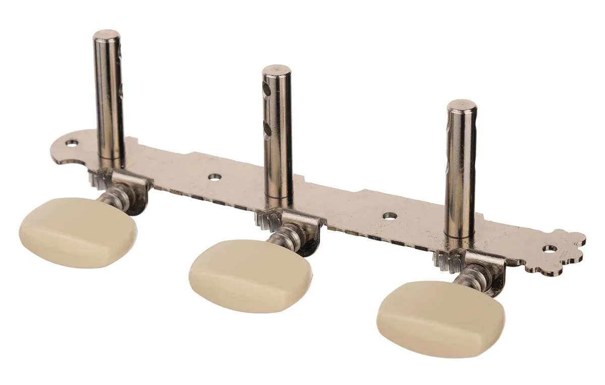 Материал: сталь. Покрытие: никель. Без пластиковой втулки, два отверстия под струну. Лепестки: пластиковые, белые. Передаточное число: 1:15. Длина планки: 110 мм. Диаметр посадочного отверстия: 9 мм. Расстояние между отверстиями: 40 мм. Без упаковки.