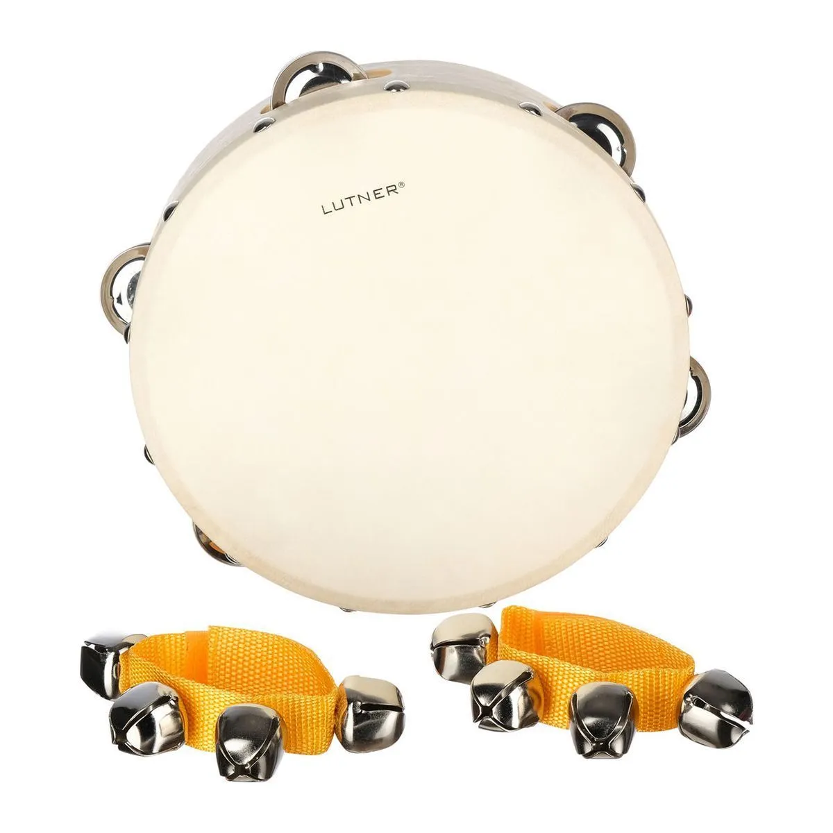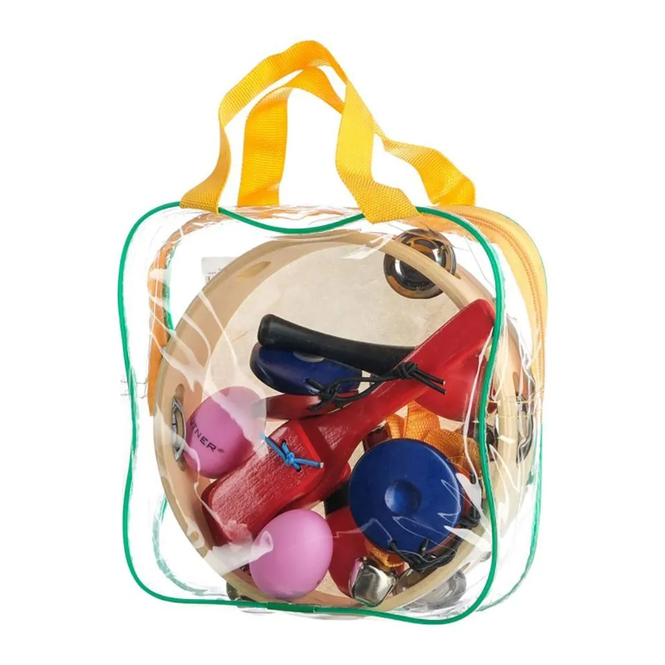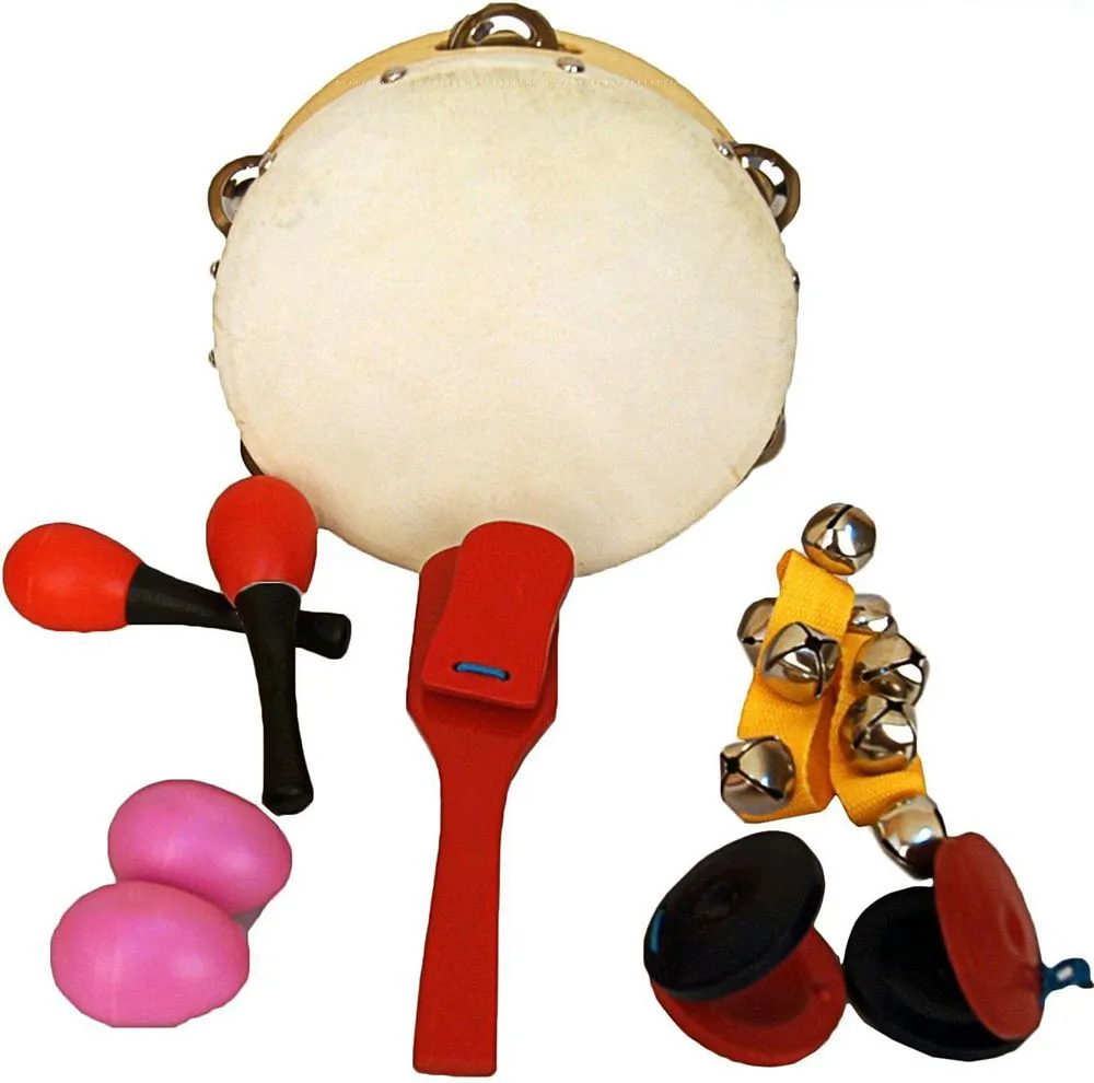 6 предметов в чехле (бубен, маракасы на ручке, кастаньеты на ручке, колокольчики на ремешке, маракасы-яйцо, кастаньеты).